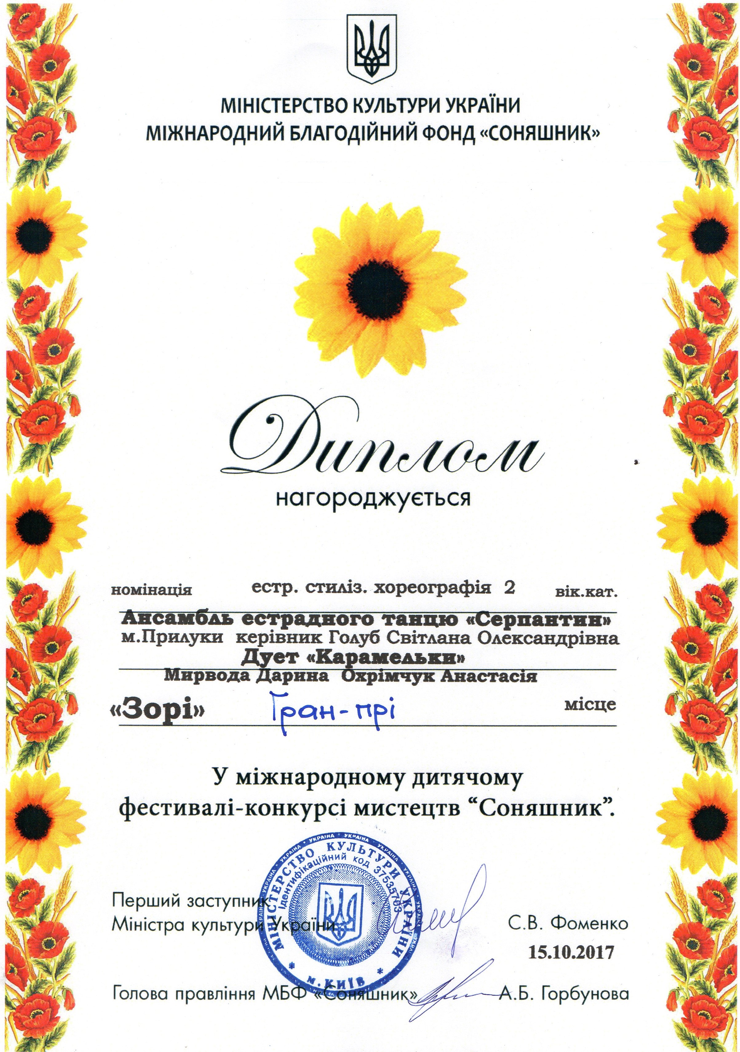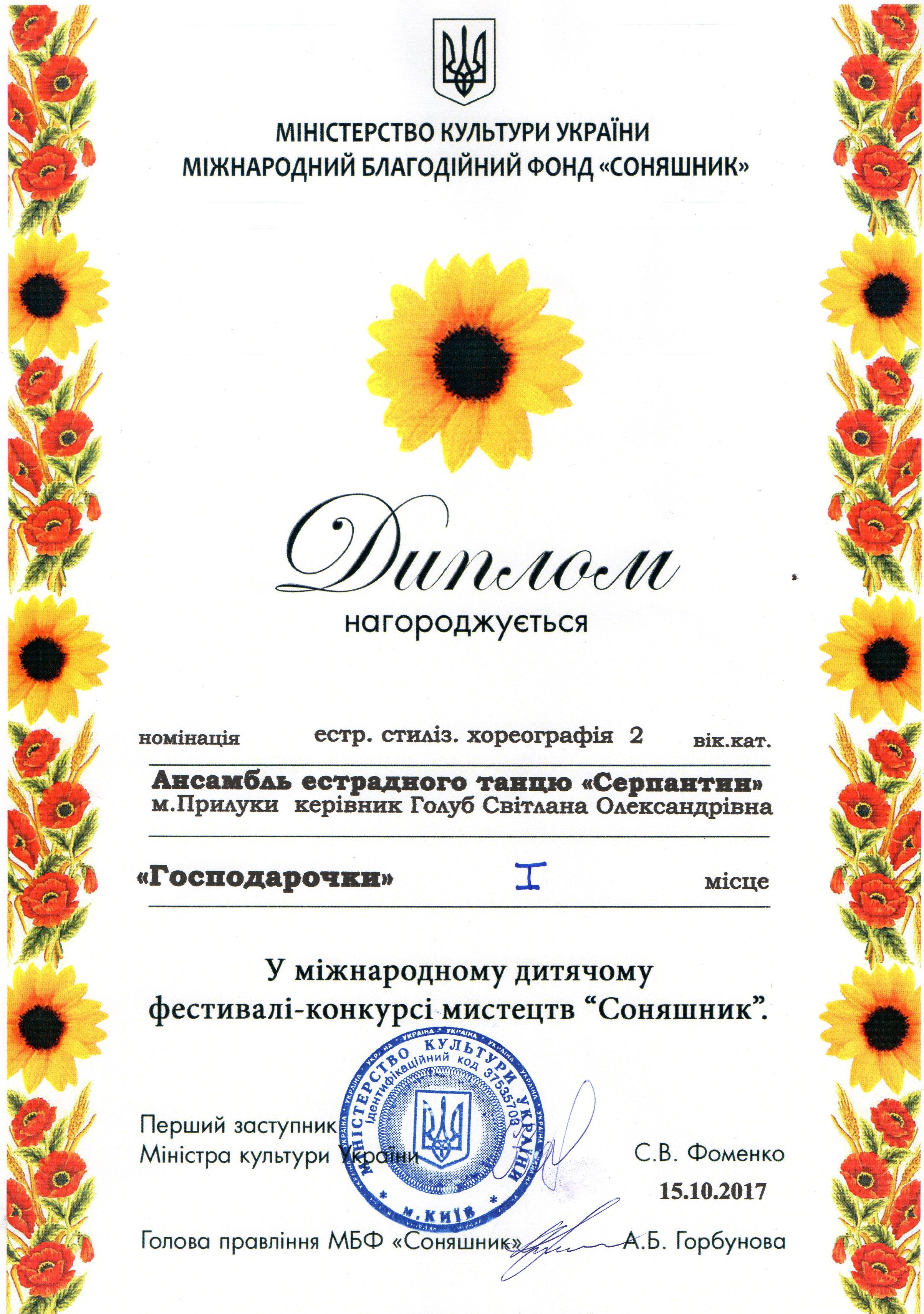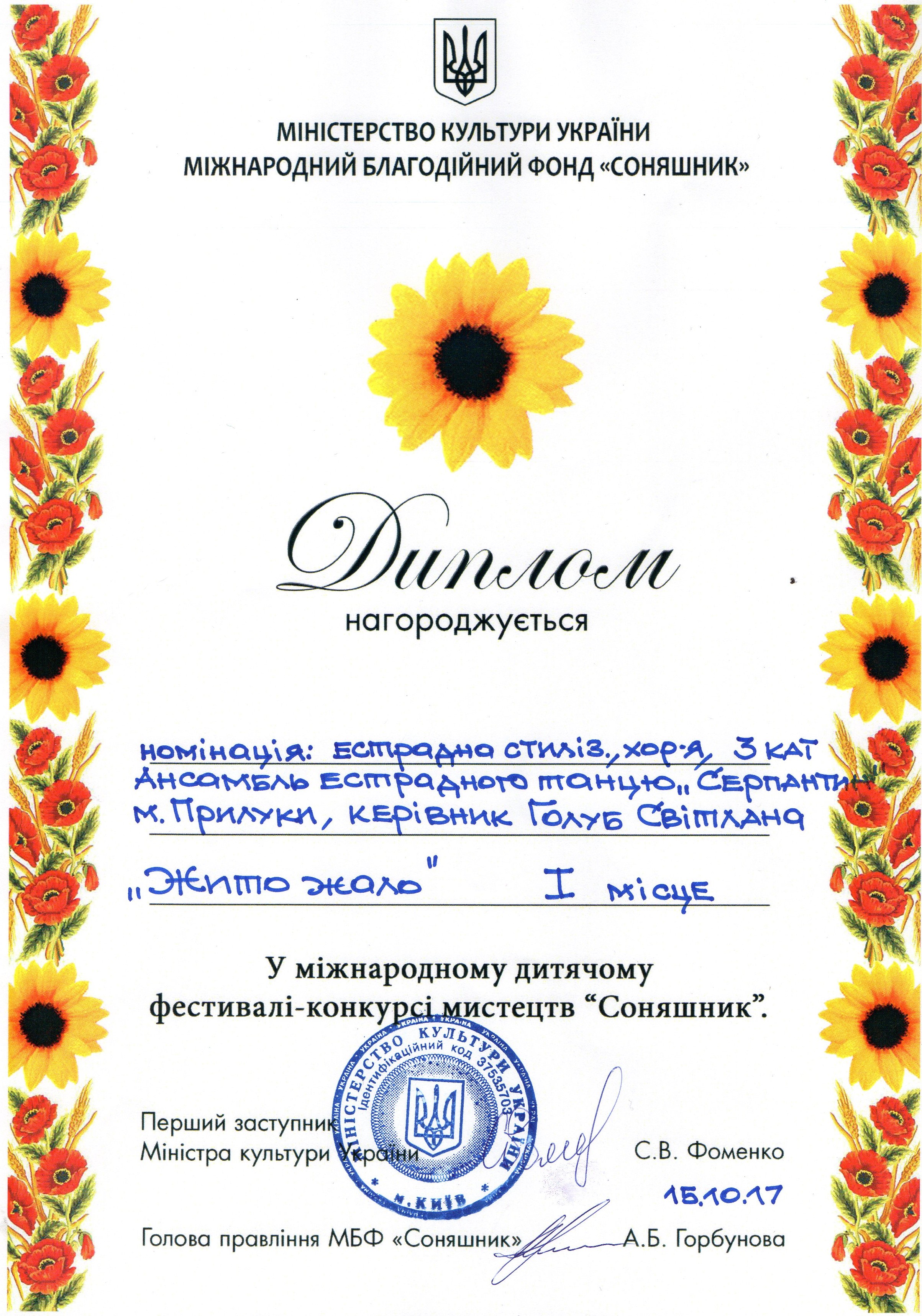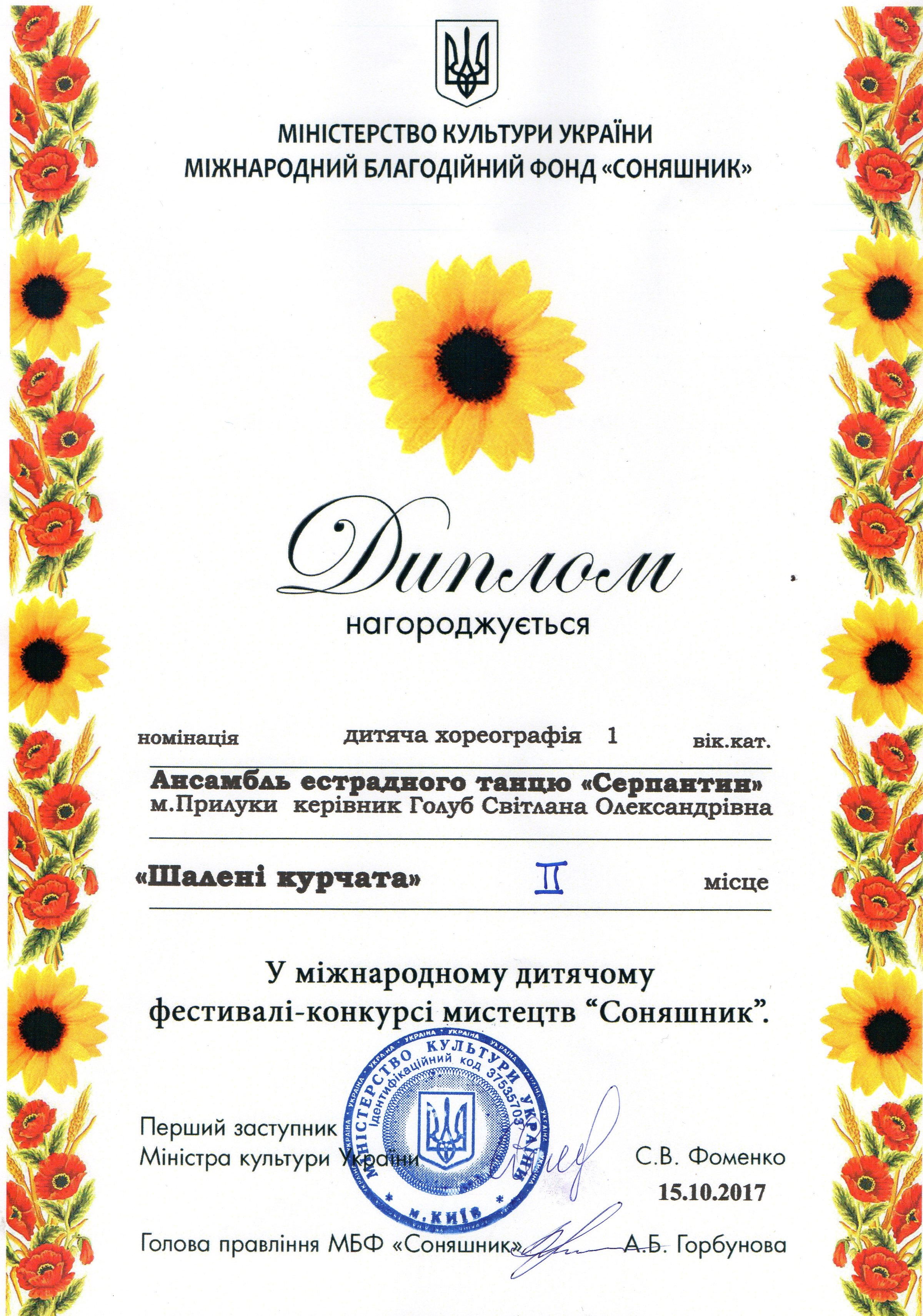15 жовтня 2017 року в концертній залі Дитячої школи мистецтв ім. Стефана Турчака м. Києві відбувся Міжнародний фестиваль – конкурс мистецтв «Соняшник».